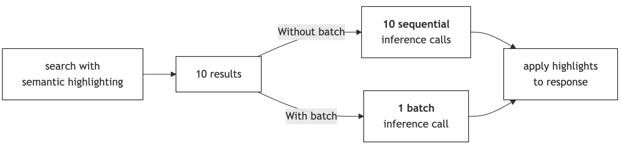 In OpenSearch 3.0, semantic highlighting processes each search result individually, making one ML inference call per result. For queries returning many results, this sequential approach can add latency that grows with result set size. OpenSearch 3.3 introduces a new approach (shown in the following diagram): collecting all search results and sending them in a single batched ML inference call, reducing overhead latency and improving GPU utilization.
