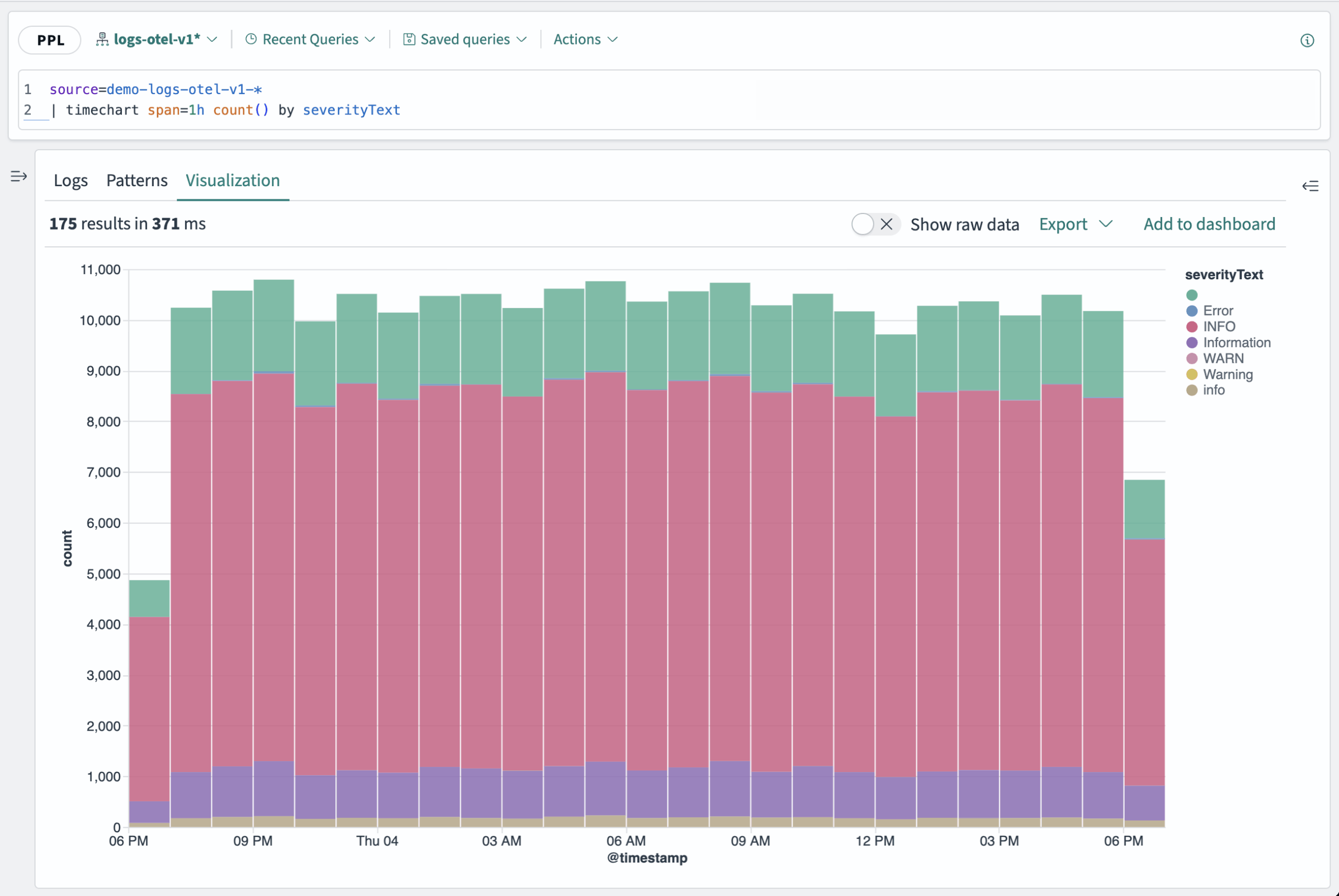 When running this query in OpenSearch Dashboards, the visualization shows log distribution over time by severity level, as illustrated in the following image.