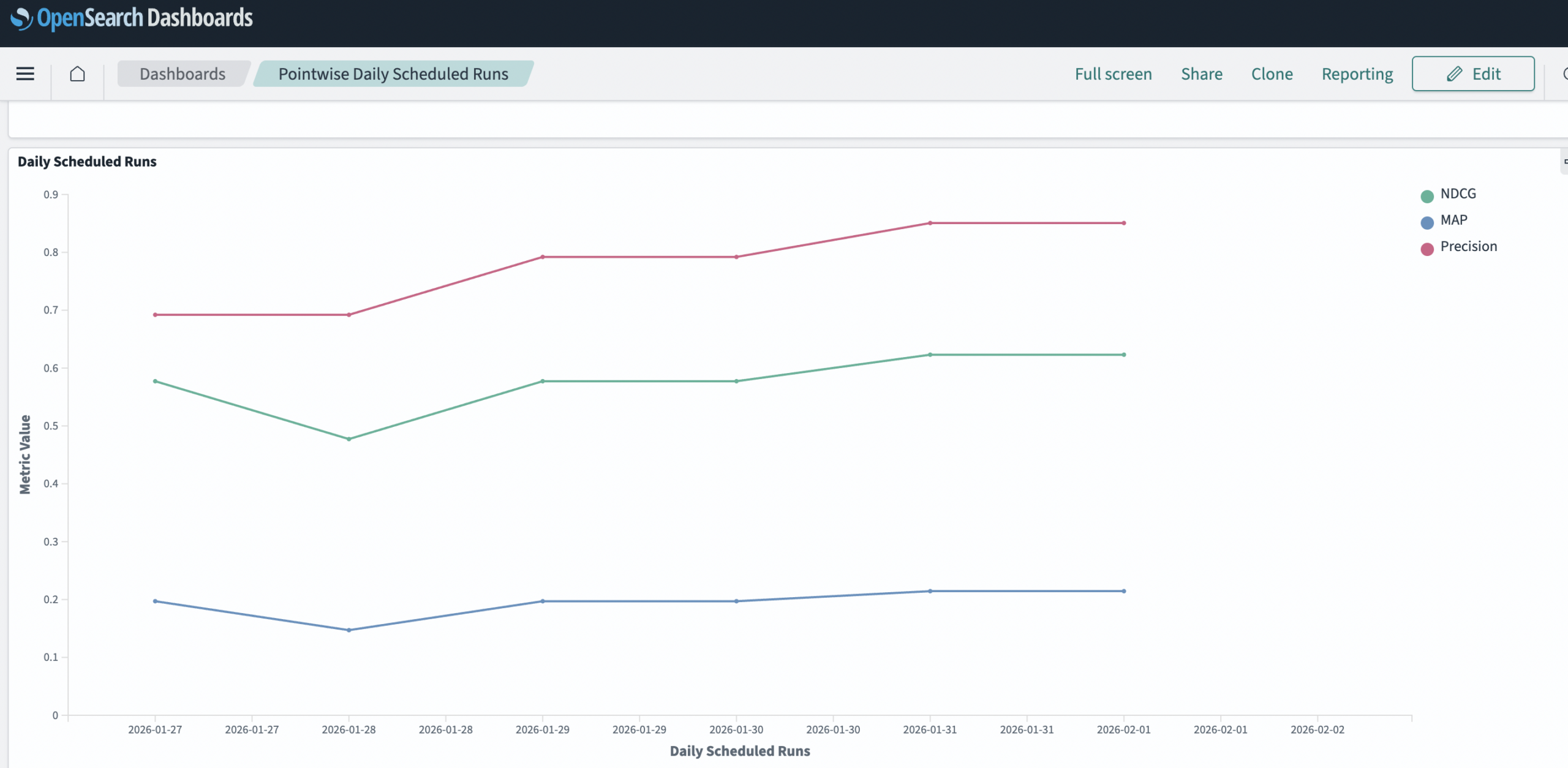 Daily scheduled Search Relevance Workbench experiments with results measured by Mean Average Precision (mAP), Normalized Discounted Cumulative Gain (NDCG), and precision search quality metrics.