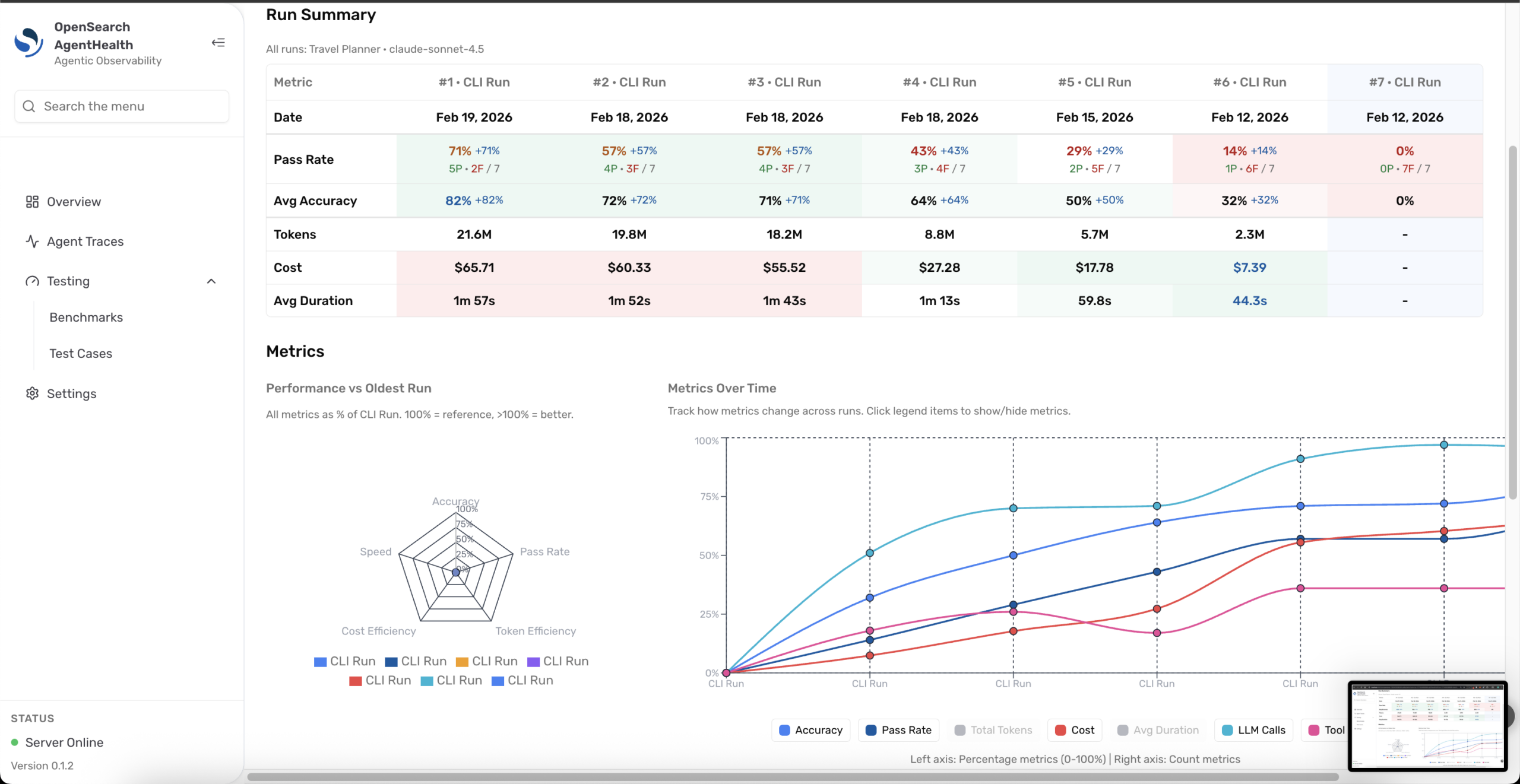 That’s it. No installation required. The full Agent Health interface is available, including traces, benchmarks, evaluations, and comparisons.