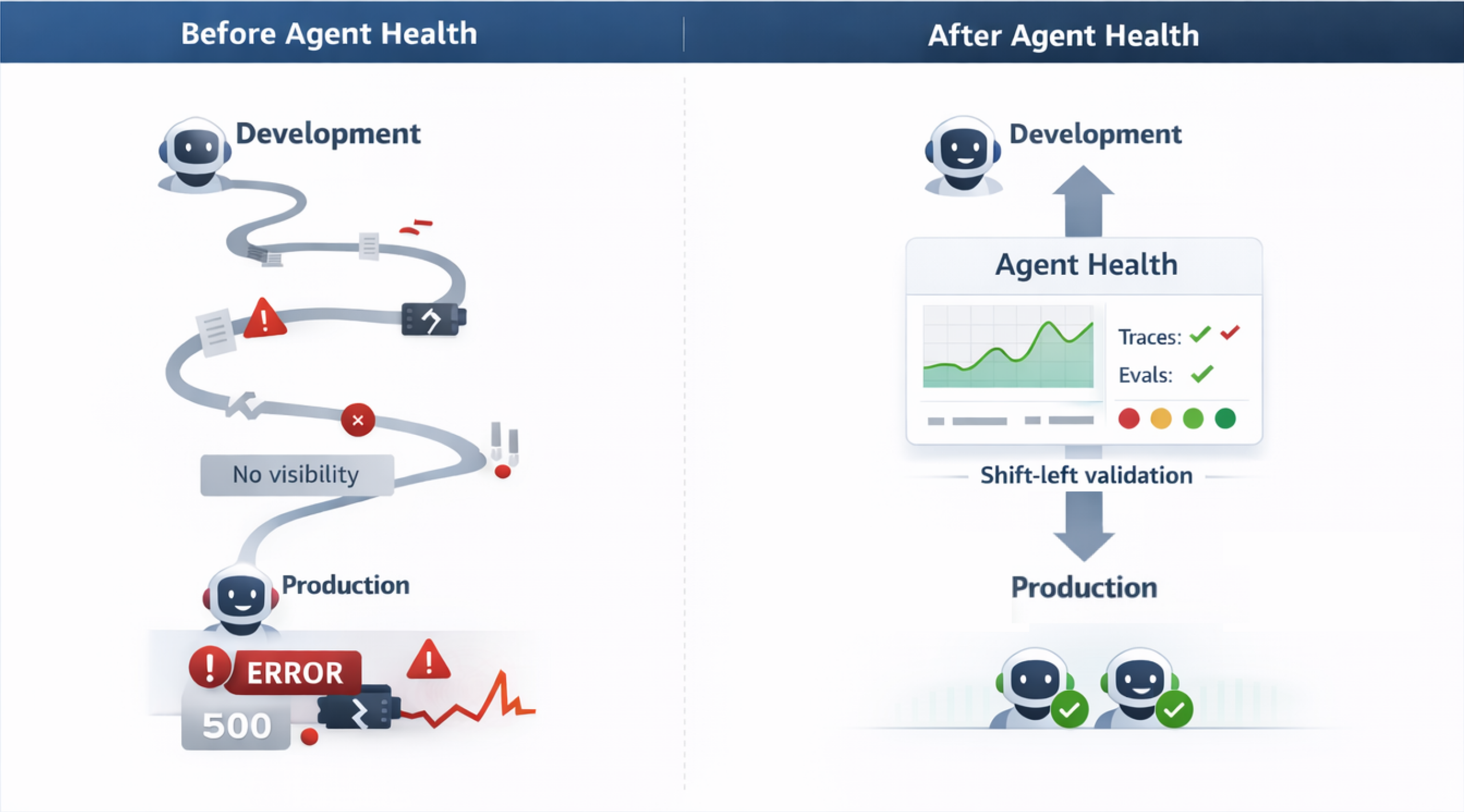 The transition from a multi-month deployment cycle to weekly deployments comes down to eliminating the manual QA process. Every time a prompt is adjusted or a new tool or skill is added to an agent, testing every possible scenario manually is not feasible at scale. Agent Health accelerates development by converting this testing process into an automated, AI-judge-based workflow. By catching regressions early during the development phase (and in CI/CD pipelines) and providing real-time visual traces of exact points where the agent failed or diverged, teams reclaim engineering hours previously lost reviewing logs or waiting for customer incident reports. You debug issues in minutes, test systematically, and deploy with greater confidence. The following diagram shows the difference between traditional agent development and the Agent Health workflow.